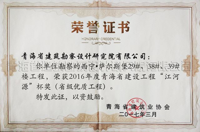 我院巖土公司勘察的西寧? 薩爾斯堡29#、38#、39#樓工程,榮獲2016年度青海省建設(shè)工程“江河源“杯獎(jiǎng)(省級(jí)優(yōu)質(zhì)工程)。